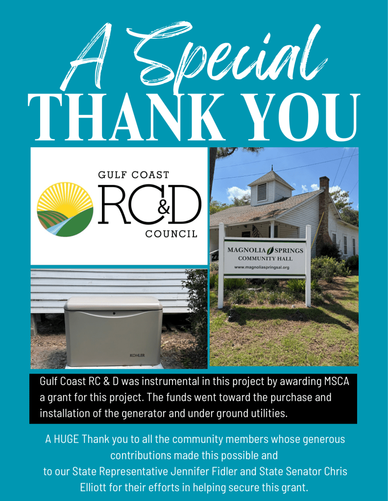We recently finished up a fundraising event to purchase a generator so that we may be a place for those to come and charge a phone, have a meal, get cool during a hurricane or weather event. A very big THANK YOU to our generous community members who donated funds and to our State Rep. Jennifer Fidler and Sen. Chris Elliott for their efforts in helping secure a grant. Gulf Coast RC& D council awarded MSCA a $12,500 grant. This grant helped purchase and install the generator and the underground utilities.